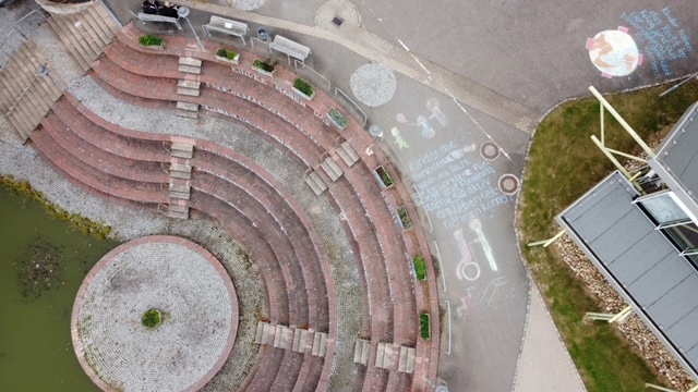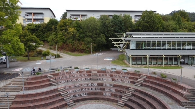 Dazu hat die Klasse die 10 wichtigsten Kinderrechte an den Stufen des Teiches schriftlich festgehalten und sie mit Zeichnungen auf dem Gelände visualisiert.