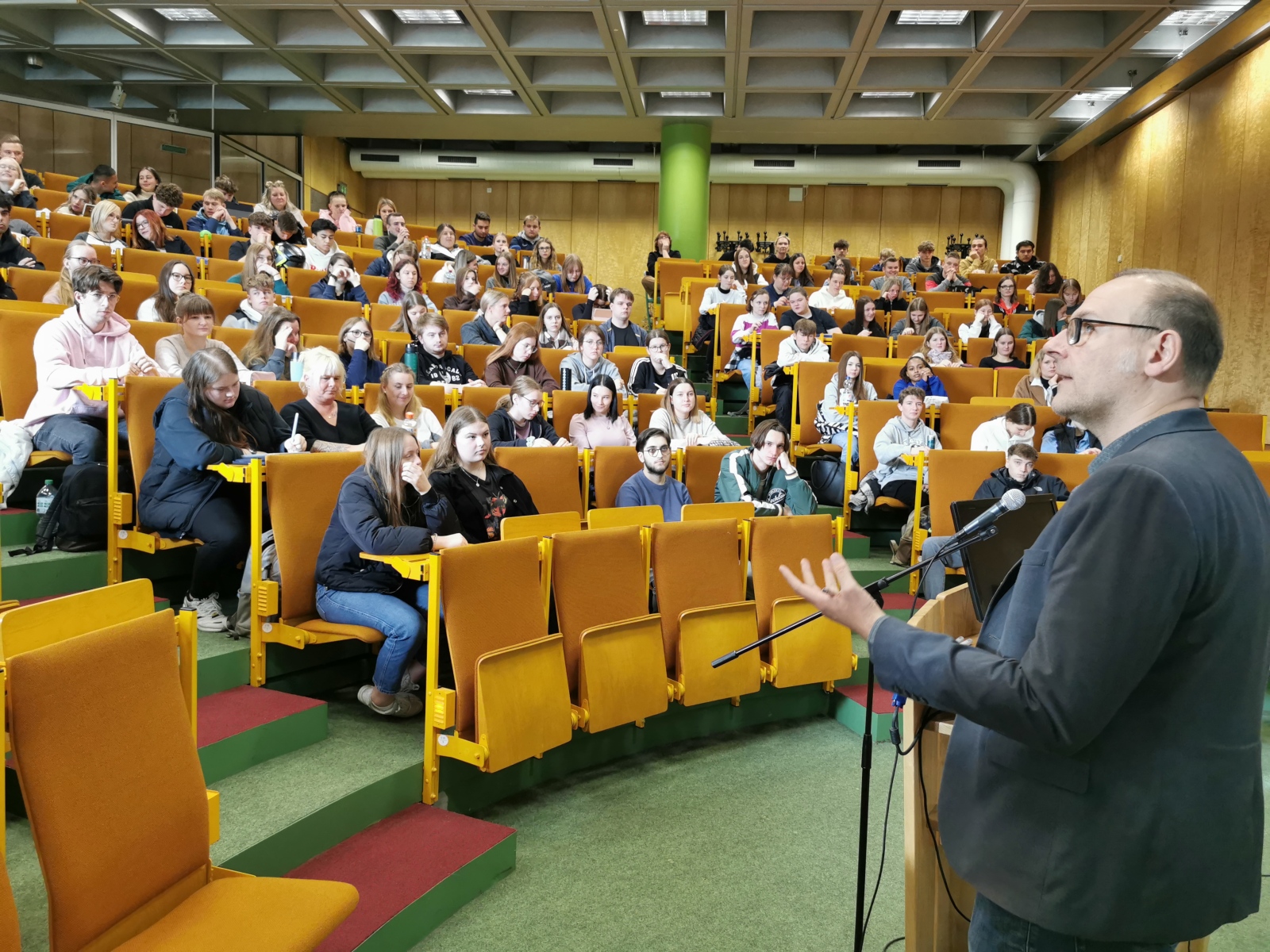 Prof. Dr. Nils Neumann spricht vor Schülern der BBS Alfeld