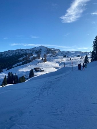 Unser zweiter Skitag begann wieder früh am Morgen mit einem Frühstück, bei dem anschließend noch ein wenig Organisatorisches besprochen wurde. Danach ging es wie am Vortag auch gegen 8:30 Uhr wieder mit dem Bus ins Skigebiet. Die Wiedereinsteiger durften heute auch nach Österreich. Die Fortgeschrittenen durften heute schon von Anfang an auf die schwarze Piste, während die Anfänger noch einmal die Grundlagen wiederholten. Außerdem teilten wir die Gruppen noch einmal, damit jeder individuell berücksichtigt wurde. Leider hatten einige etwas Muskelkater vom Vortag, doch das hielt die meisten nicht vom Fahren ab. In der Mittagspause setzten wir uns auf eine Alm und tranken typisch für Skifahrer, Skiwasser. Danach fuhren wir in Kleingruppen selbständig auf ausgesuchten Pisten, bis es dann für uns um 16:30 Uhr wieder zurück in unsere Anlage ging.