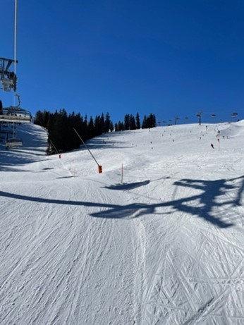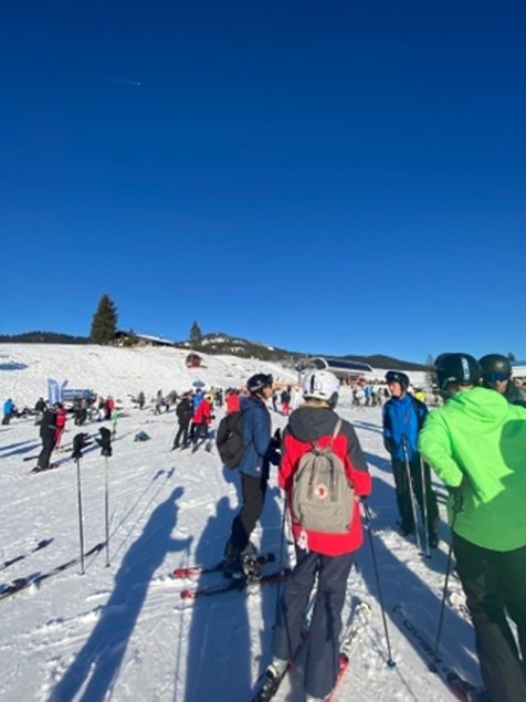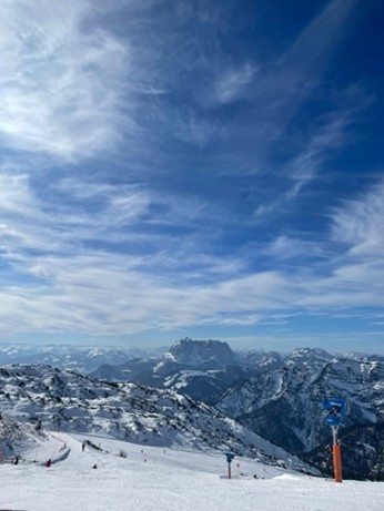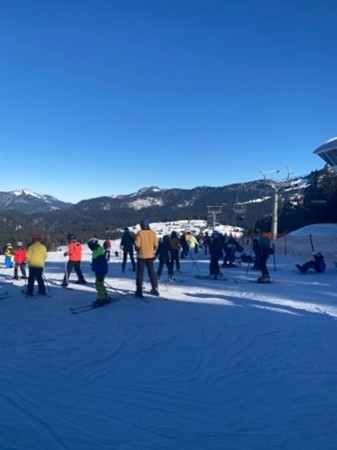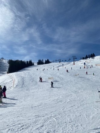 An unserem dritten Skitag gab es – oben angekommen – einen Lehrerwechsel unter den Gruppen. Danach ging es nach ein paar Fahrten in Deutschland, auch für die Anfänger mit dem Lift nach Österreich. Auf der 1.800m hohen Steinplatte genossen wir erstmal den atemberaubenden Ausblick auf die Alpen und machten im Anschluss eine kleine Pause. Danach fuhren alle wieder los und wagten sich, jeder wie er sich traute, auf die rote oder auch auf die schwarze Piste. Die Anfänger durften sich auf die roten Pisten wagen und das bisher gelernte Wissen anwenden. Es ging einige Male runter und wieder hoch, bis man sich sicher fühlte und die roten Pisten langsam beherrschte. In der Mittagspause gab es auf der Alm typische Südtirolische Leckereien, wie Kaiserschmarrn, Germknödel oder Käsespätzle. Bis es dann die Talabfahrt wieder runterging und wir wie üblich um 16:30 Uhr wieder zurück in die Anlage fuhren.