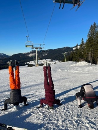 Sehr zur Freude der Schülerinnen und Schüler startete der Skitag noch ein wenig früher und wir fuhren schon um 8:00 Uhr mit dem Bus ins Skigebiet los. Dort angekommen durften sich die Fortgeschritten in kleinen Gruppen zusammenfinden und allein losfahren. Für die Anfänger und Fortgeschrittenen gab es jeweils zwei kleinere Prüfungen. So konnten sie das Gelernte anwenden und zeigen, was sie können. Nachmittags ging es für sie dann wieder nach Österreich, wo die Wiedereinsteiger mit den Fortgeschrittenen, die eine selbstausgedachte Choreo einstudieren und vorzeigen mussten, nach dem Buddy-Prinzip mal ohne Lehrkräfte fahren durften. Dass der Tag besonders anstrengend für alle war, bemerkte man an der nur 20-minütigen Busfahrt zurück in die Anlage, bei der der ein oder andere vor Erschöpfung einschlief. Doch dies hielt keinen auf, den letzten Abend nochmal richtig auszunutzen. Wir wollen nicht zu viel verraten und vielleicht könnt ihr euch vorstellen was für ein guter Abschlussabend dies war, wenn wir euch erzählen, dass es in einem der Häuser keine Gläser mehr gab, und die Müslischalen zu Gläsern umfunktioniert wurden …