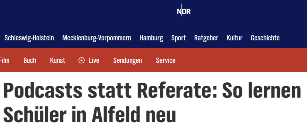 Beitrag vom NDR An der BBS Alfeld wird Unterricht neu gedacht: Statt trockener Referate wird Unterrichtsstoff, wenn es passt, mit Mikrofonen, Kopfhörern und „richtigem“ Podcast-Equipment…